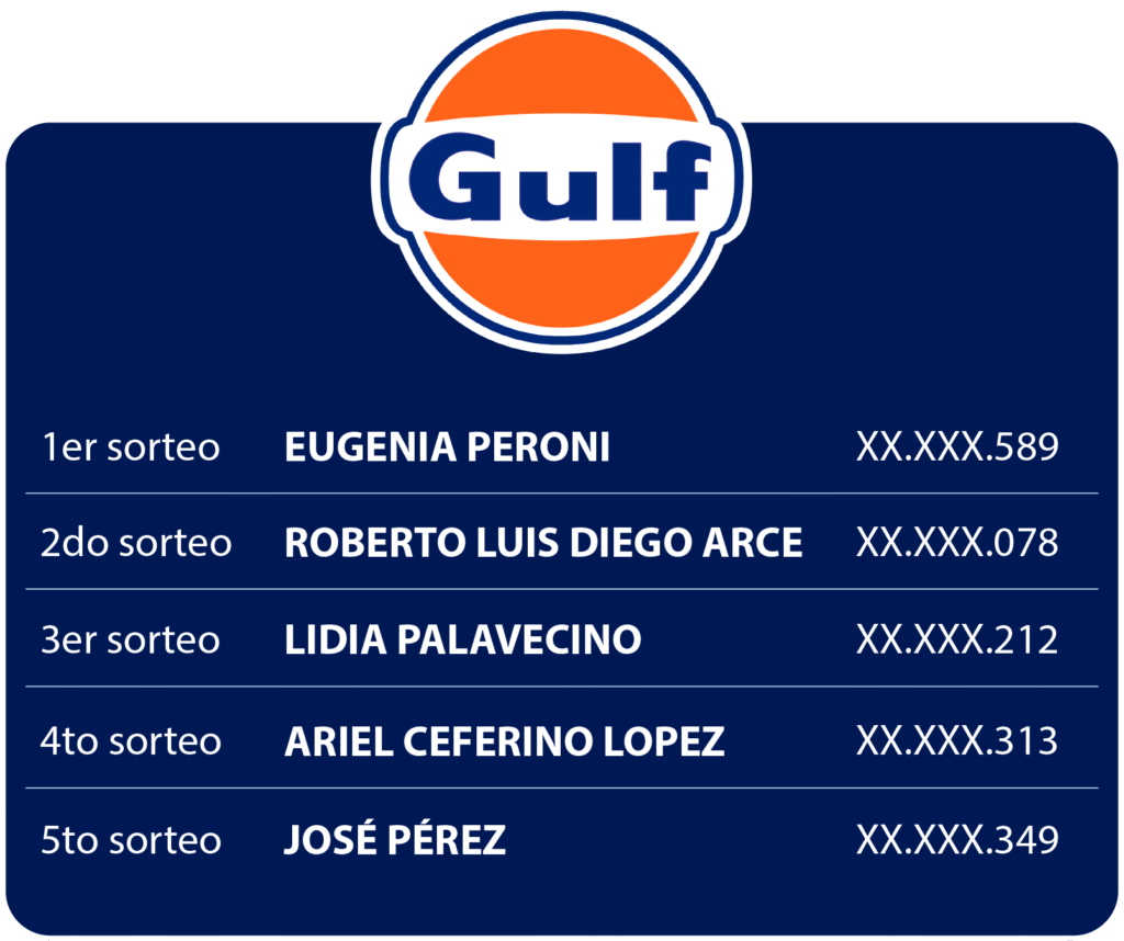 En caso de que seas uno de los ganadores te avisaremos por el número de teléfono o email que dejaste en la landing. Por eso, es importante que dejes cargados tus datos correctamente. Vas a tener un plazo de 30 días corridos para hacer valer el premio a partir del día siguiente al que te notificamos. Caso contrario, se pasará al primer suplente. Además, vas a poder ver a todos los ganadores en http://www.gulfcombustibles.com.